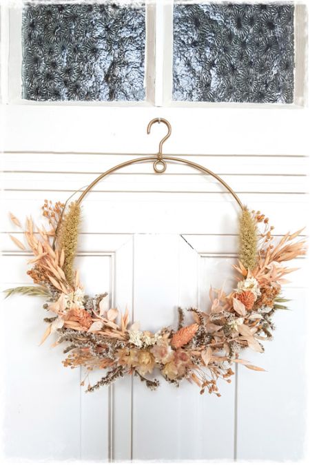 Droogbloemen halve krans om gouden ring - zalmroze (20cm)
