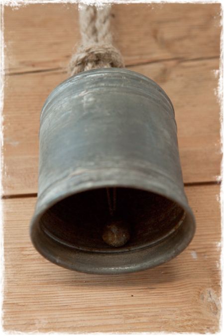 Brocante kerstversiering: zinken rechte kerstklok aan een stevig jute koord.